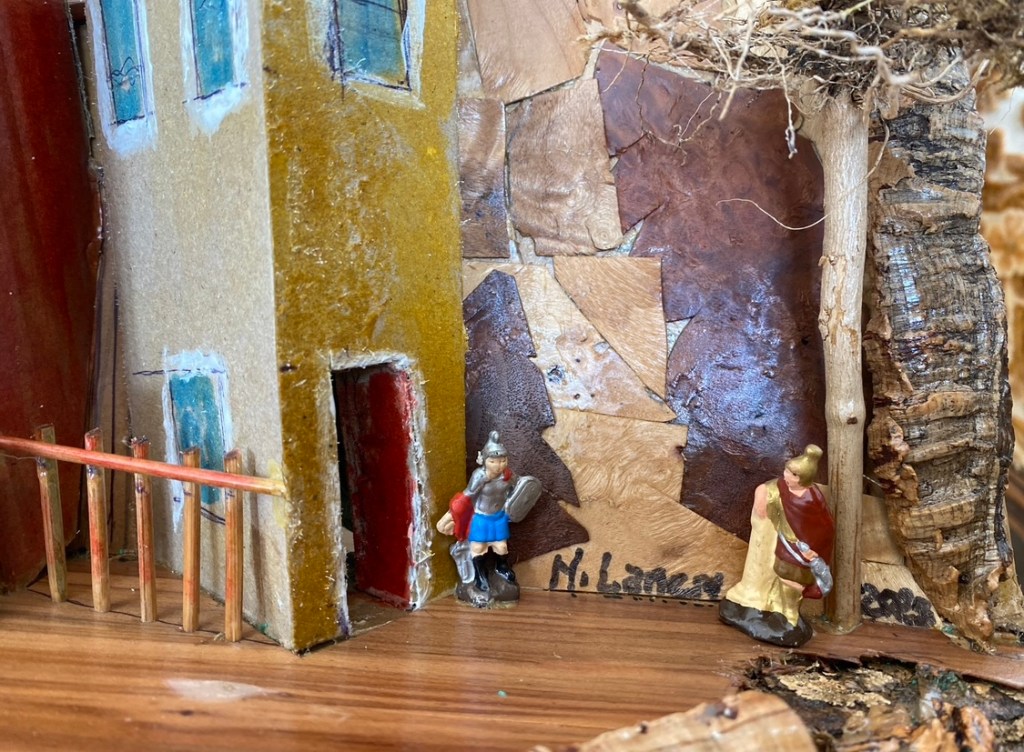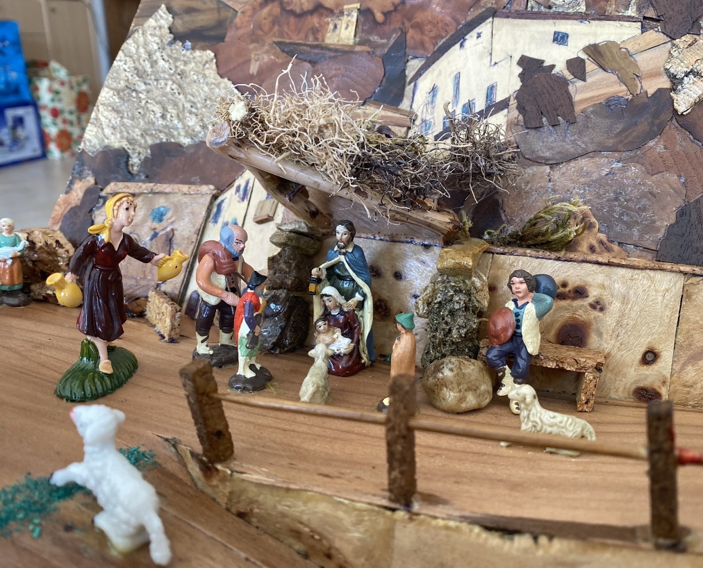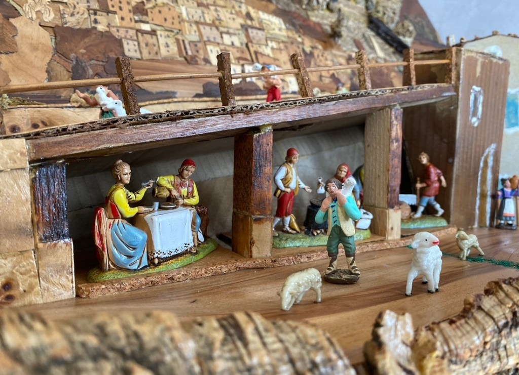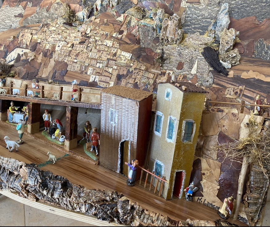 Ai piedi del borgo è rappresentato la Natività: all’incrocio della rampa che sale e di quella che scende per l’esattezza.