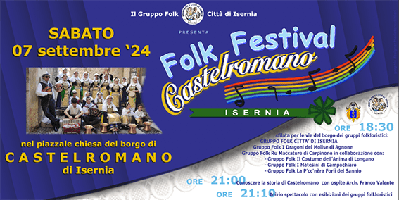 A sigillo del primo anno di vita del Gruppo Folk Città di Isernia abbiamo organizzato l’evento del PRIMO FESTIVAL FOLK a Castelromano (Isernia-Molise-ITALY) presentato dall’amica Antonella Gatta, associazione Il Costume dell’Anima di Longano (Is).